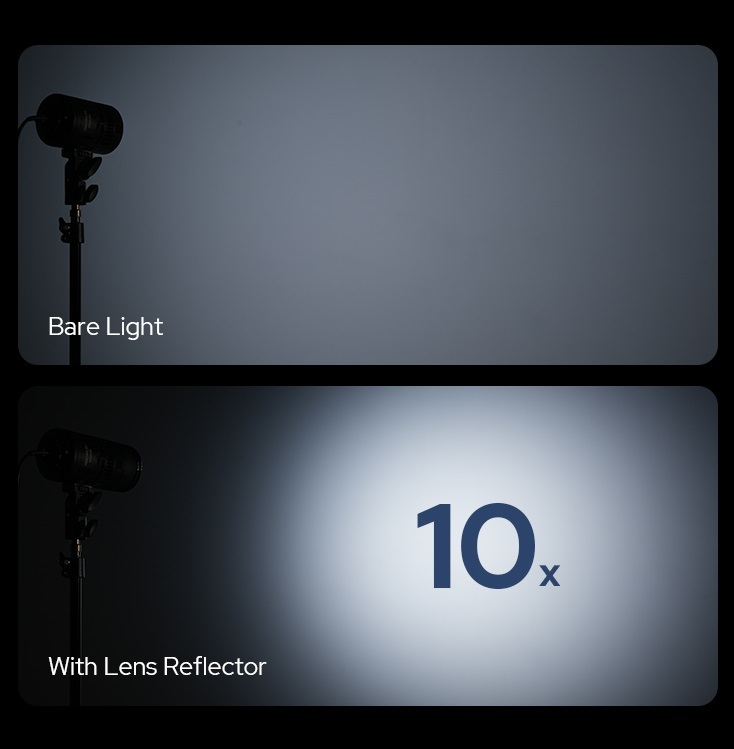 Нова оптична конструкція Godox, компактна та ефективна, забезпечує до 10 разів більшу яскравість порівняно з чистим світлом.