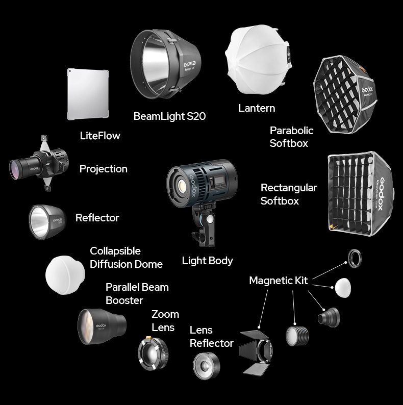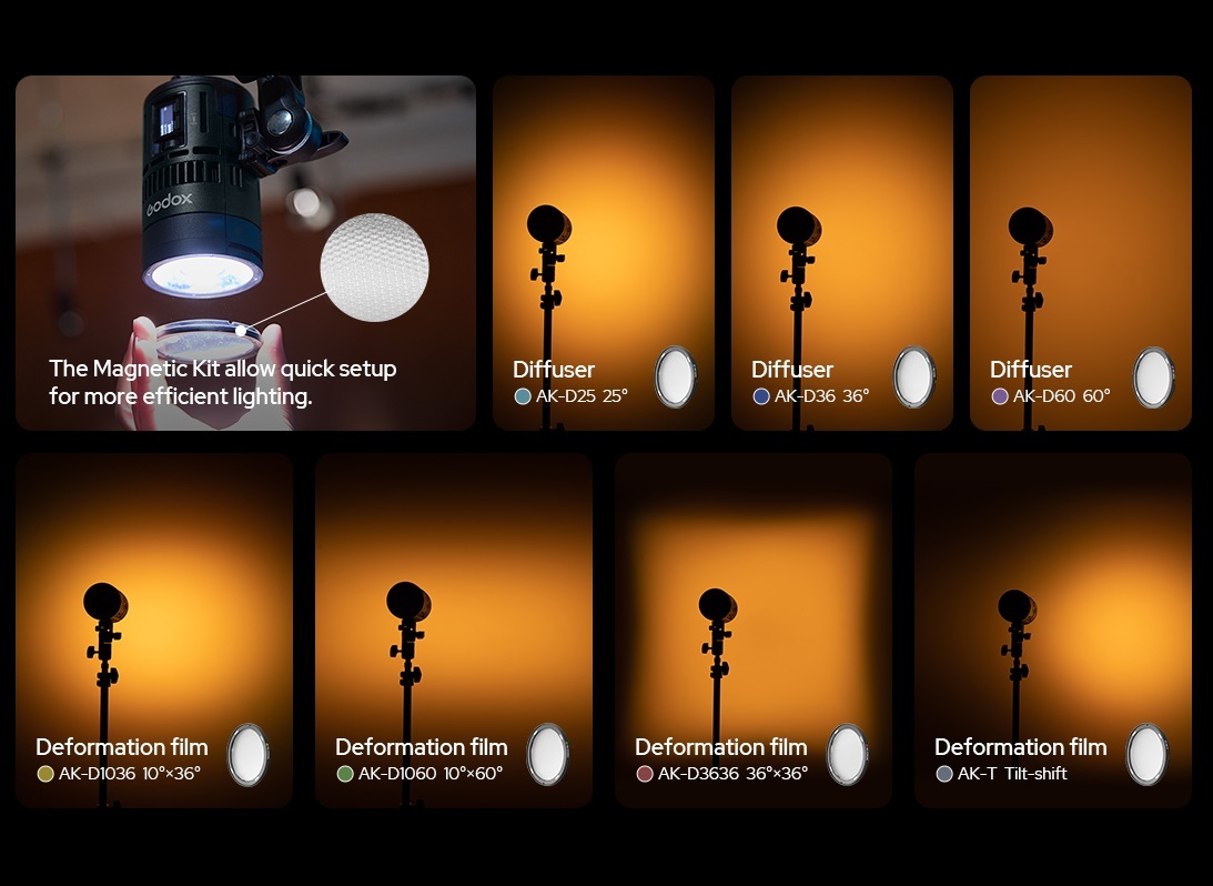 Магнітний комплект має мікрооптичну конструкцію Godox та працює з лінзовими відбивачами для контролю площі світла та кута розсіювання.