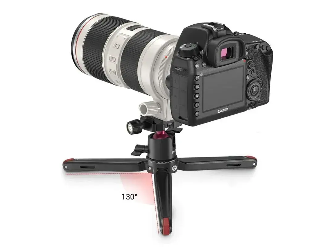 Настільний штатив SmallRig з панорамним кульової голівкою BUT2664 - це ідеальний мініатюрний штатив для компактних дзеркальних і бездзеркальних фотоапаратів, екшн-камер, смартфонів і ін. Розрахований в основному для панорамної або предметної зйомки в статичному положенні. Але він також забезпечує додаткову стійкість при зйомці з рук і в русі. Штатив виготовлений з алюмінієвих сплавів, витримує навантаження до 20 кг, а кульова головка - до 2 кг. Міні штатив міцний, надійний, збалансований. Гумові ніжки надають йому ще більше властивостей антиковзання, тому штатив можна розташовувати на будь-якій поверхні і підвищується безпека зйомки.