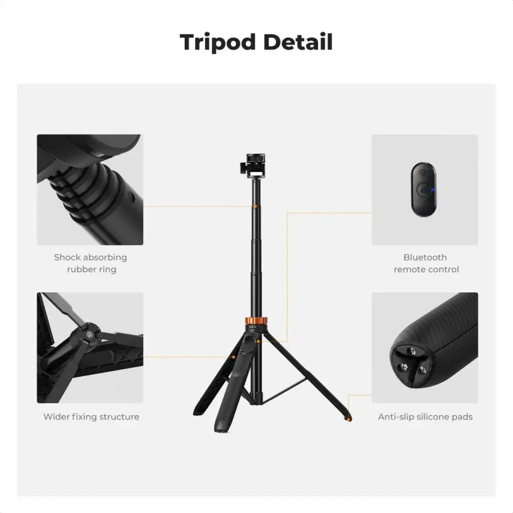 Конструкція виготовлена з високоякісного алюмінієвого сплаву, що забезпечує жорсткість штанги навіть при повному розкладанні. Ручка трансформується в три стійкі ніжки, перетворюючи палицю на штатив. У комплект входить універсальний набір кріплень: затискач для смартфона, адаптер для GoPro та стандартний гвинт 1/4" для компактних камер. Знімний Bluetooth-пульт дозволяє керувати камерою телефону дистанційно на відстані до 10 метрів.