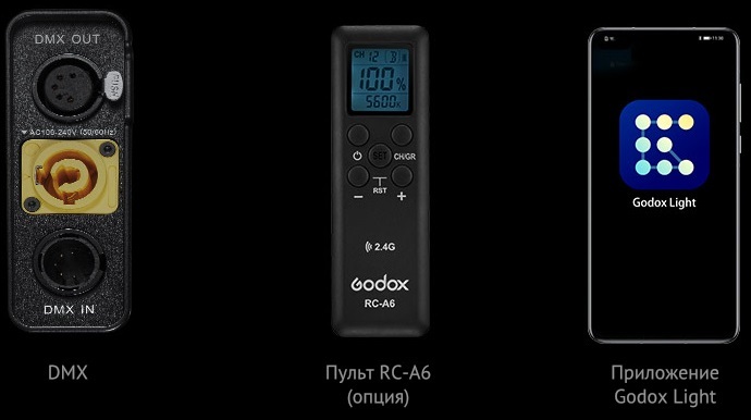 Крім налаштування безпосередньо за допомогою блоку керування, освітлювач підтримує керування за стандартом DMX512. Також можна налаштувати параметри бездротового зв'язку за допомогою пульта дистанційного керування RC-A6 (придбано окремо) або зі смартфона по Bluetooth із установленим додатком Godox Light.