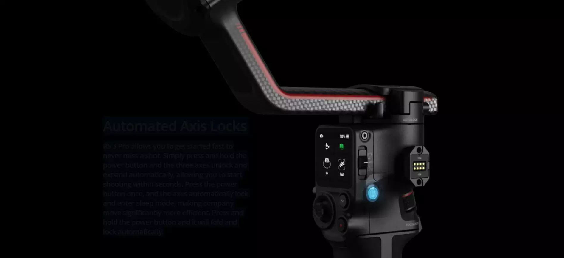 RS 3 Pro дозволяє швидко розпочати роботу, щоб не пропустити кадр. Просто натисніть та утримуйте кнопку живлення, і три осі розблокуються та розширяться автоматично, що дозволить вам розпочати зйомку протягом кількох секунд. Натисніть кнопку живлення один раз, і осі автоматично заблокуються та перейдуть у сплячий режим, що значно підвищить ефективність роботи компанії. Натисніть та утримуйте кнопку живлення, і він автоматично складеться та заблокується.
