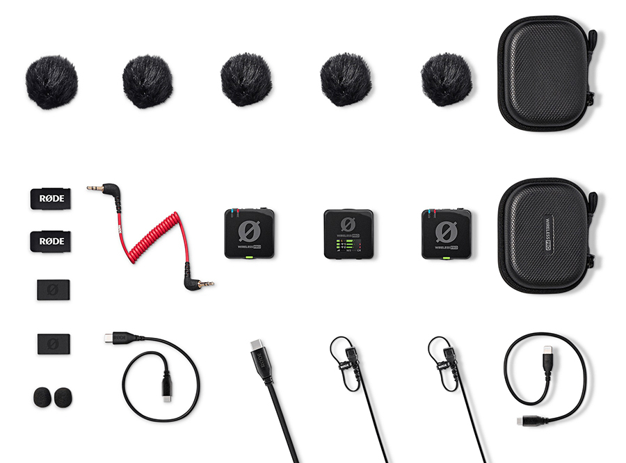 У комплект Wireless PRO входить все необхідне для налаштування і бездротового запису звуку, просто дістаньте девайс із коробки. У наборі два професійні мікрофони Lavalier II, волохаті вітрозахисти для використання на вулиці, пара MagClip GO, для кріплення передавачів у будь-якому місці, зарядний смарткейс і зручний набір аксесуарів для зберігання мікрофонів, кабелів і затискачів.