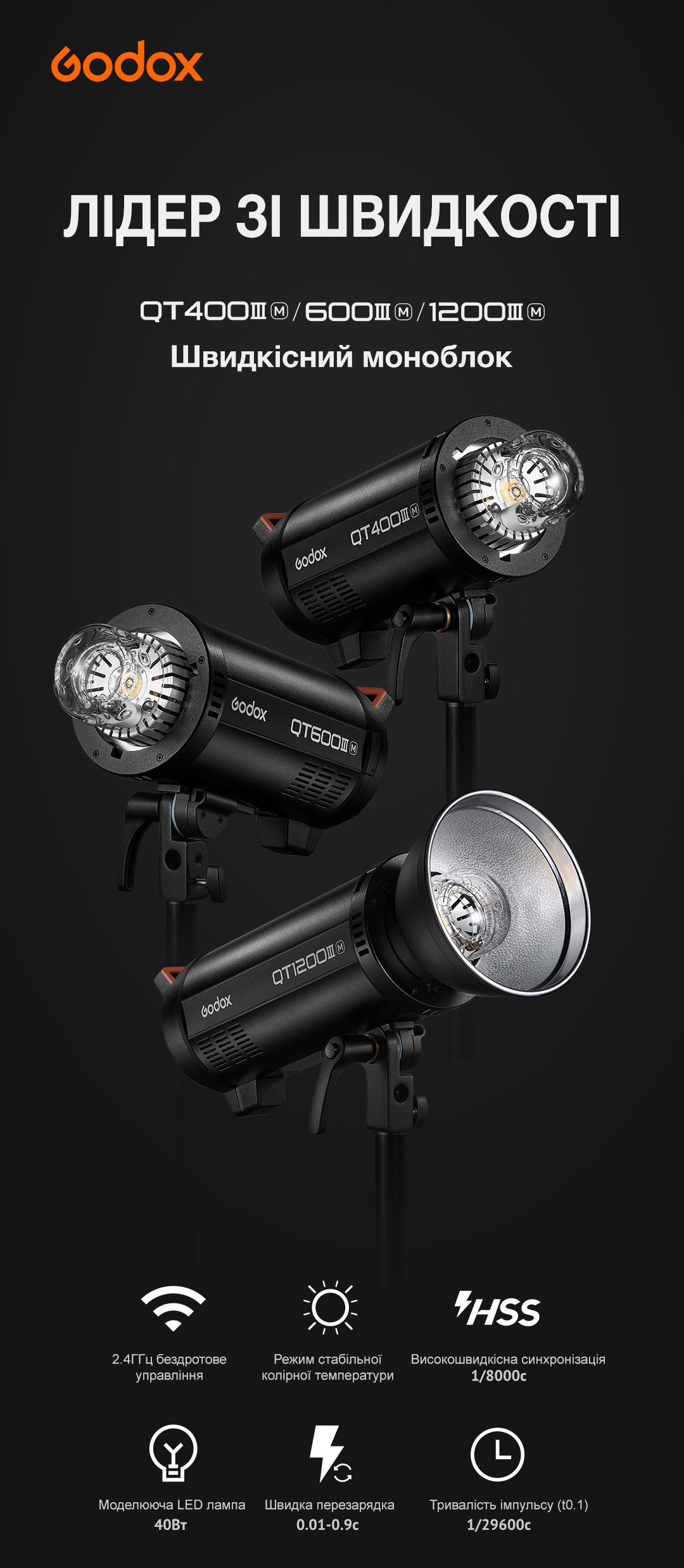 Дотримуючись наших неухильних принципів розробки високоякісного, різноманітного, технологічно передового фотообладнання, Godox гордо представляє новий моноблок QTIII, еволюцію серії Quicker. Завдяки численним оновленням він має покращені характеристики у функціях пілотного світла, високошвидкісної синхронізації HSS та інших ключових можливостях, що дозволяє повністю розкрити творчий потенціал фотографів та підвищити ефективність динамічного виробництва.