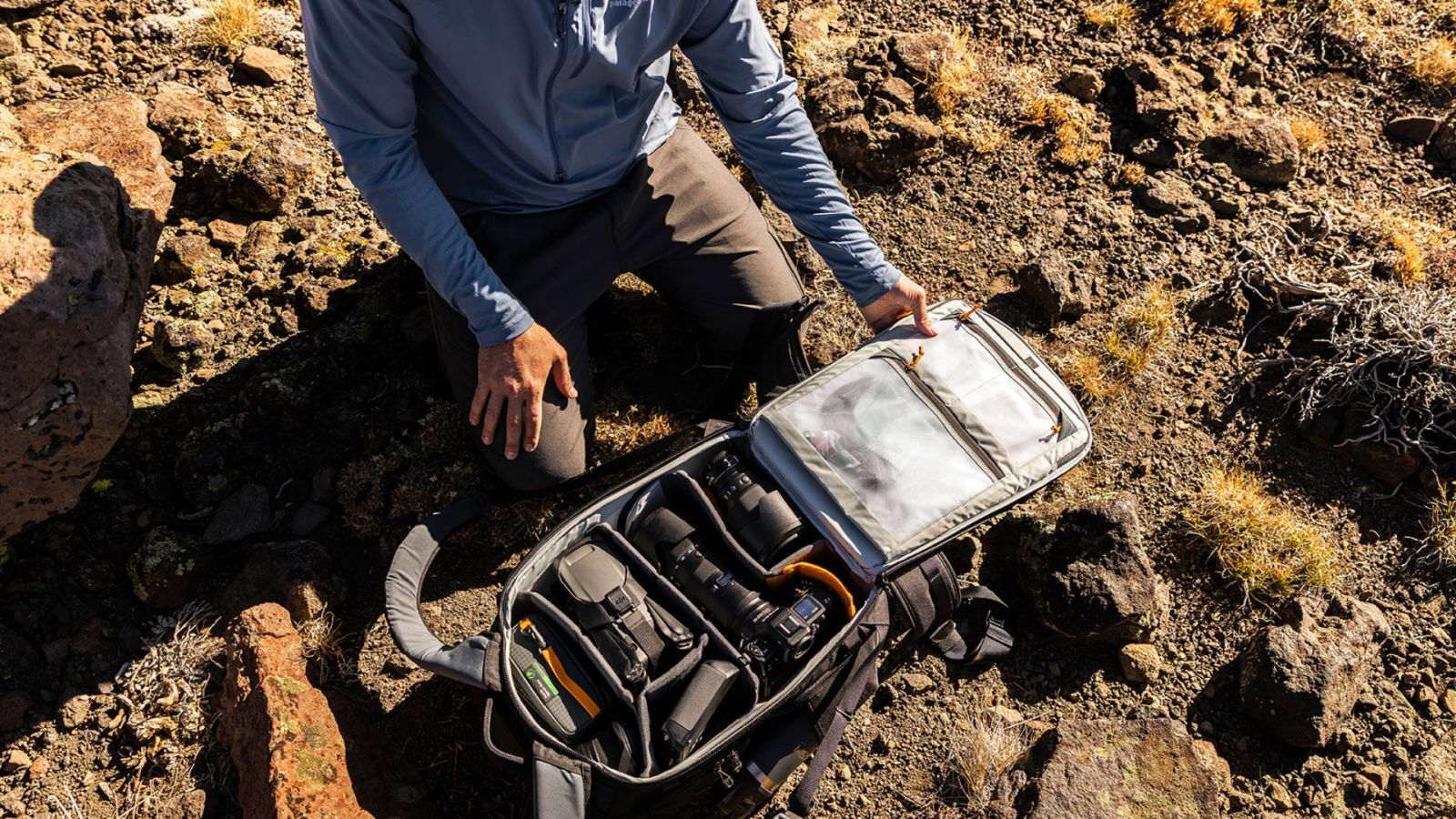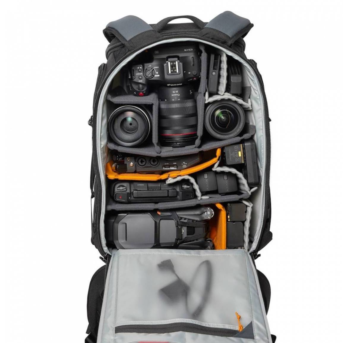 У задньому відсіку ви знайдете прозорі кишені-органайзери на блискавці поверх кишені для ноутбука CradleFit, в яку поміщається MacBook Pro до 16 дюймів. Бічні входи мають великі зовнішні еластичні кишені, що вміщають пляшку об'ємом до 1 л, та посилені у нижній частині для підтримки штатива. Додаткові петлі та кишені у верхній частині боковин забезпечують швидкий доступ до речей та надійне кріплення штатива. Рюкзак стоїть вертикально сам по собі, що полегшує доступ до вашого спорядження.