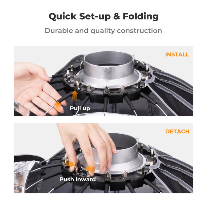 Глибокий параболічний софтбокс із гладким сріблястим внутрішнім покриттям розширює, розсіює та пом'якшує світло, забезпечуючи більш рівномірний і широкий розподіл освітлення. Це дозволяє пом'якшити жорсткі відблиски, усунути небажані тіні та зберегти оригінальну кольоропередачу.